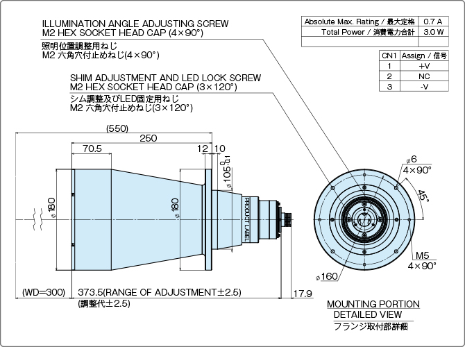 ・Maximum rated current is 700mA and electrical power consumption is 3W.
